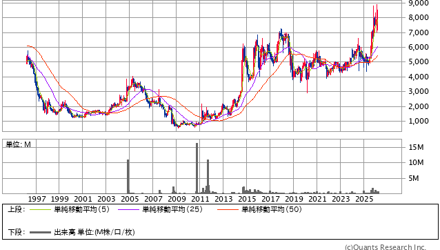 添付の長期チャートを見ると、株価は長い期間で見ると大きく下がる局面もありましたが、その後はゆっくりと上昇しており、長期では右肩上がりに近い動きになっています。