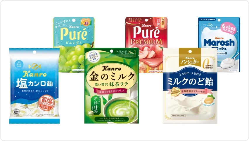 社名にもなっている「カンロ飴」をはじめ、「健康のど飴」「金のミルク」「ピュレグミ」など、キャンディやグミを中心とした商品で知られています。
