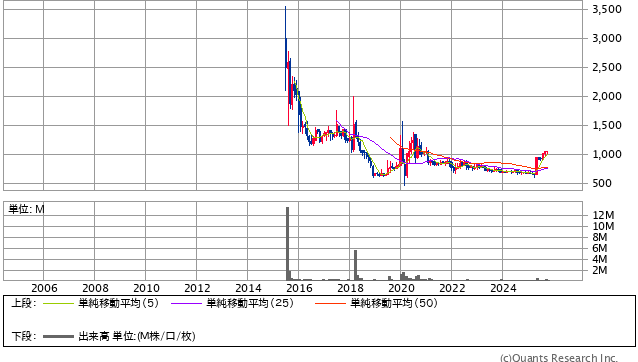 富士山マガジンサービスの株価は、20年の長期チャートで見ると、2015年に一時3,000円を超える高値をつけたあと、長期的な下落トレンドを経て現在は底値圏で推移している形です。