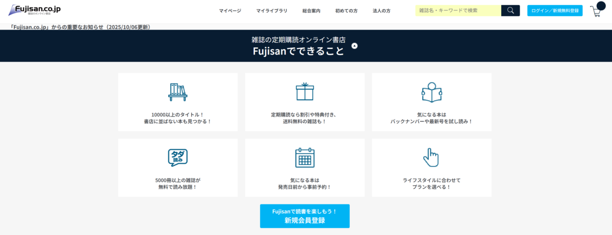 1万誌を超える品ぞろえにより、一般誌から専門誌まで幅広いニーズに対応しており、定期購読ならではの割引や送料無料、初回号選択、月額払いなど、継続購読を促す仕組みが整っています。