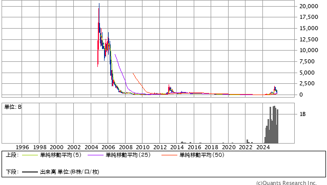 メタプラネットの株価を長期で見ると、2000年代前半に急騰し、その後は長く低迷した歴史が特徴的です。