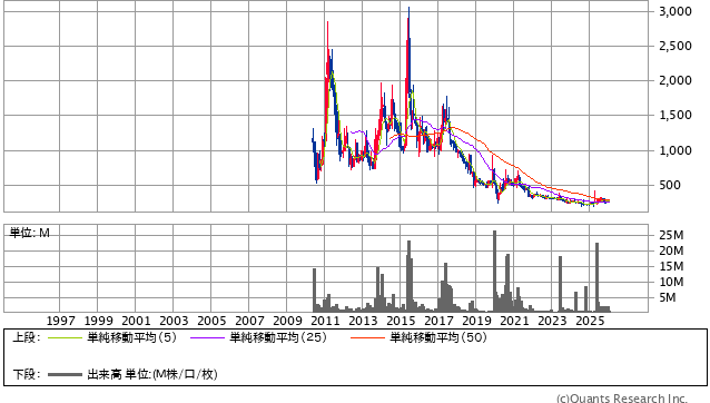 長期目線で見ると、まず気になるのは「株価の長い下向き」です。