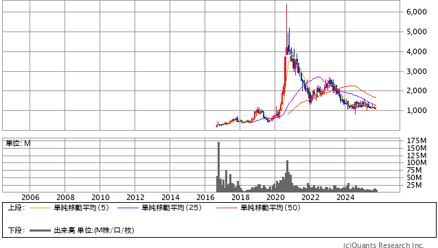 過去10年以上のチャートを見ると、2020年前後に急上昇した後、調整を経て現在は1,000円台前半で落ち着いています。