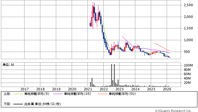 チャートは、上場直後の高値から大きく下がったあと、直近数年は低いところで横ばい気味に動いています。