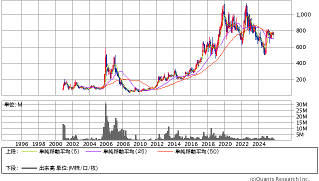 まず、30年チャートを確認すると、過去の波はありながらも右肩上がりの推移を維持しており、企業としての基礎体力が確実に積み上がっていることがわかります。