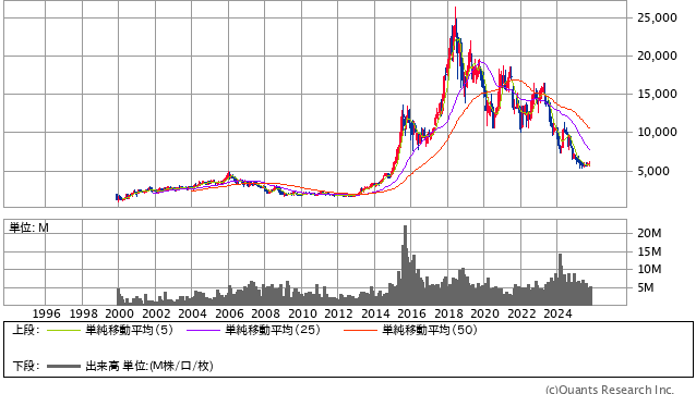 コーセーの株価は、長期的に見ると2013年から2018年にかけて大きく上昇したあと、現在まで緩やかな下降トレンドにあります。