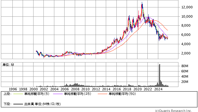 株価は長期的には右肩上がりを描いてきましたが、直近数年は高値からの調整局面に入っており、「成長期待はあるがリスクも意識したい銘柄」という位置づけになっています。