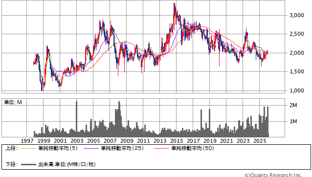 株価は30年で見ると「大きく上下しながらも、長い目では横ばい〜やや下向き」寄りで、直近は2,000円前後で落ち着く場面が多い印象です。
