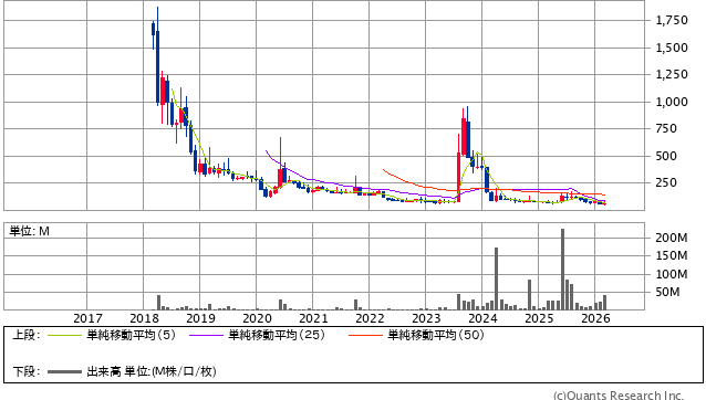 ただし、長期チャートを見ると上場後の高値から大きく水準を切り下げており、業績もなお赤字が続いているため、長期保有を前提にした安定株として見るのはかなり難しい銘柄です。