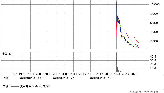 上場後に大きく期待されたあと、長い下落トレンドが続いており、市場はこの会社の成長ストーリーをかなり厳しく見直してきたと考えられます。