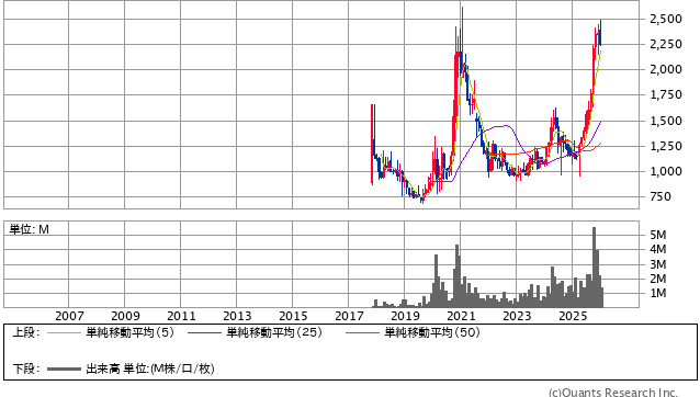 チャート(長期)で見ると、2019年以降に大きく伸びて、その後に調整を挟みながらも、直近はもう一段上を試す動きが見えます。