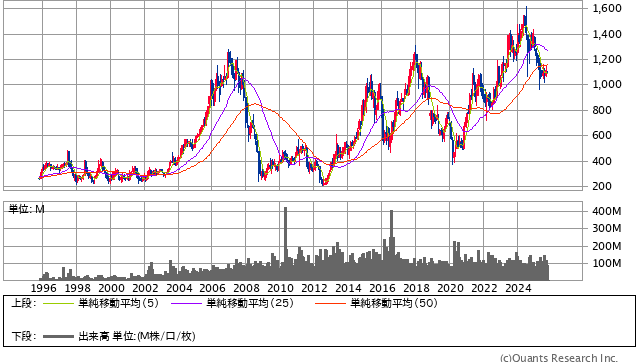 世界的な景気変動や為替の影響を強く受ける事業内容であるにもかかわらず、長期の視点では底堅い推移を示しており、企業としての基盤がしっかりしていることが分かります。