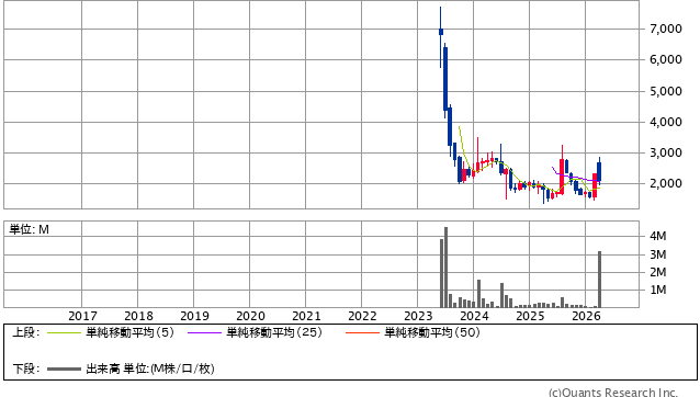 2023年に東証グロース市場へ上場した銘柄で、10年チャートでは上場直後の急騰から大きく下落し、その後も上値の重い展開が続いています。