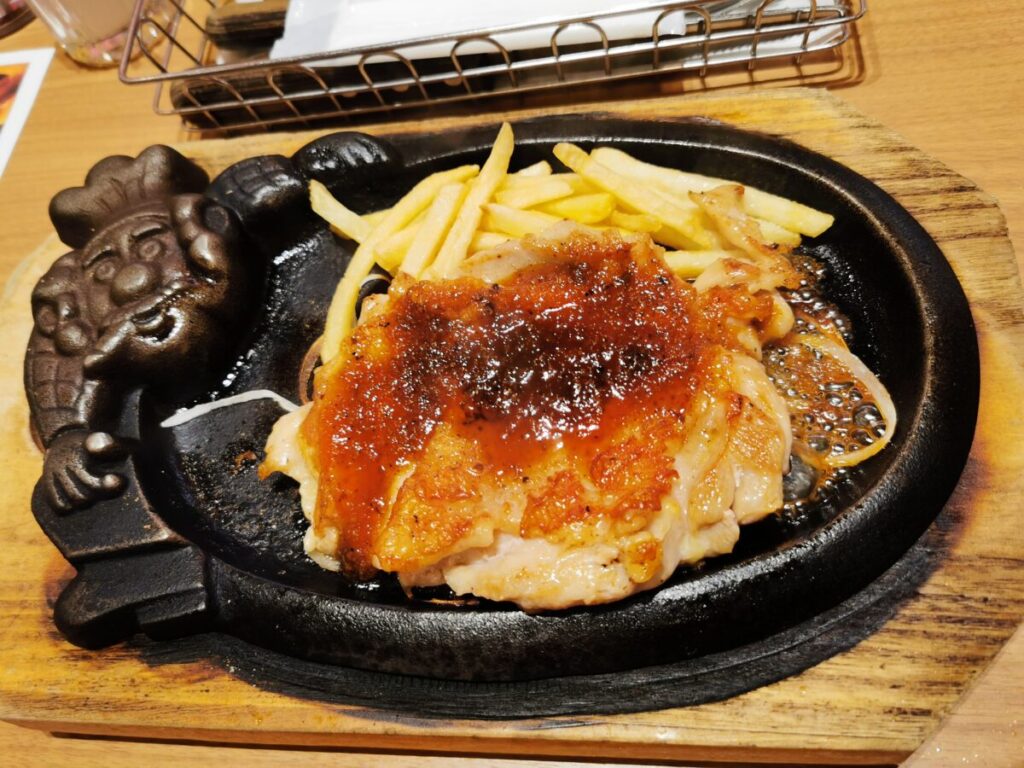 熱々の鉄板に盛り付けられたチキンステーキは、まずその香ばしい香りで食欲を刺激してくれます。