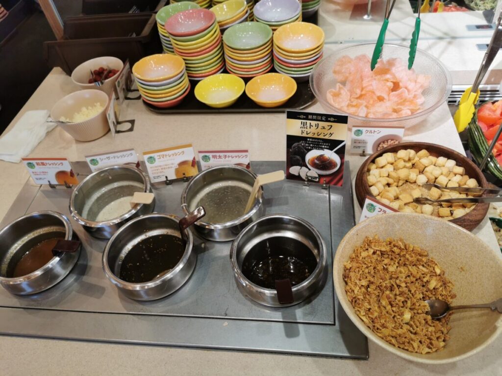 サラダバーの横には、色とりどりのボウルと並んでドレッシング&トッピングコーナーが用意されています。