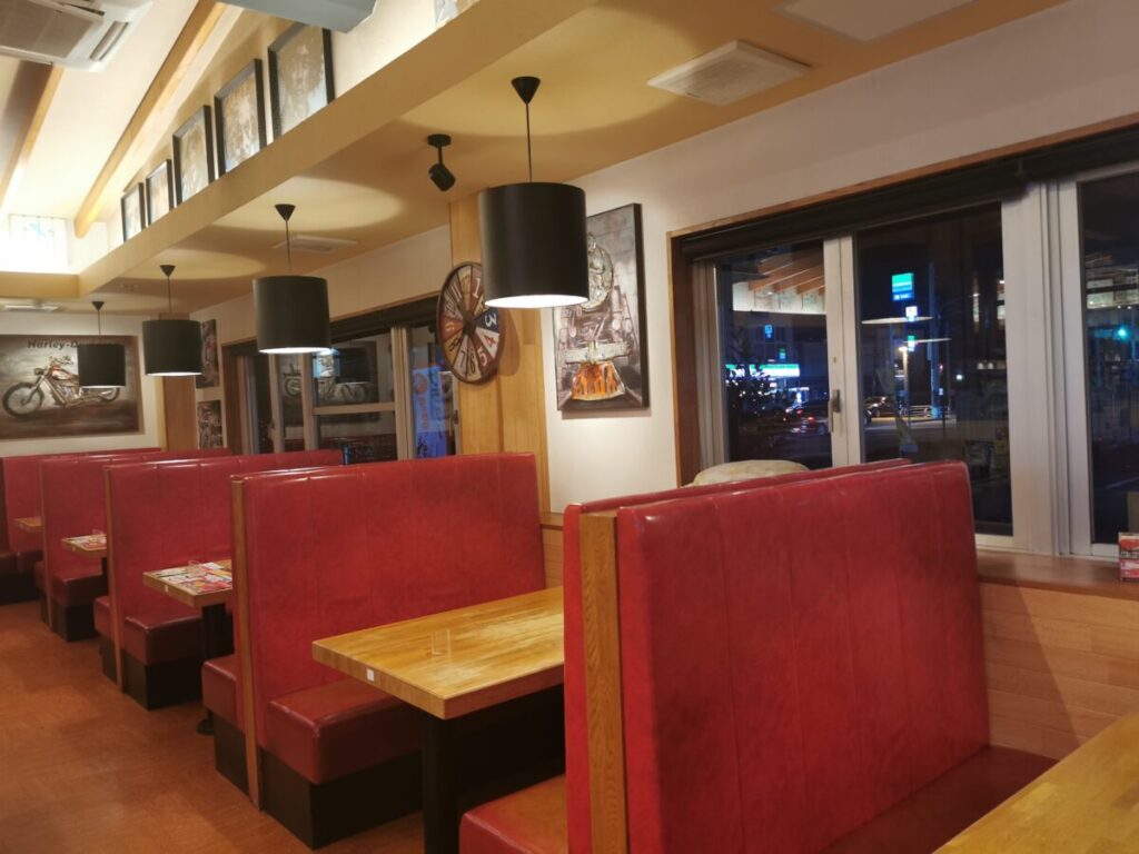 店内はウッド×レンガ調を基調に、赤いレザーのボックス席がずらり。