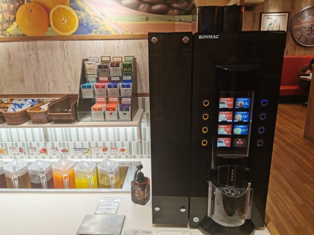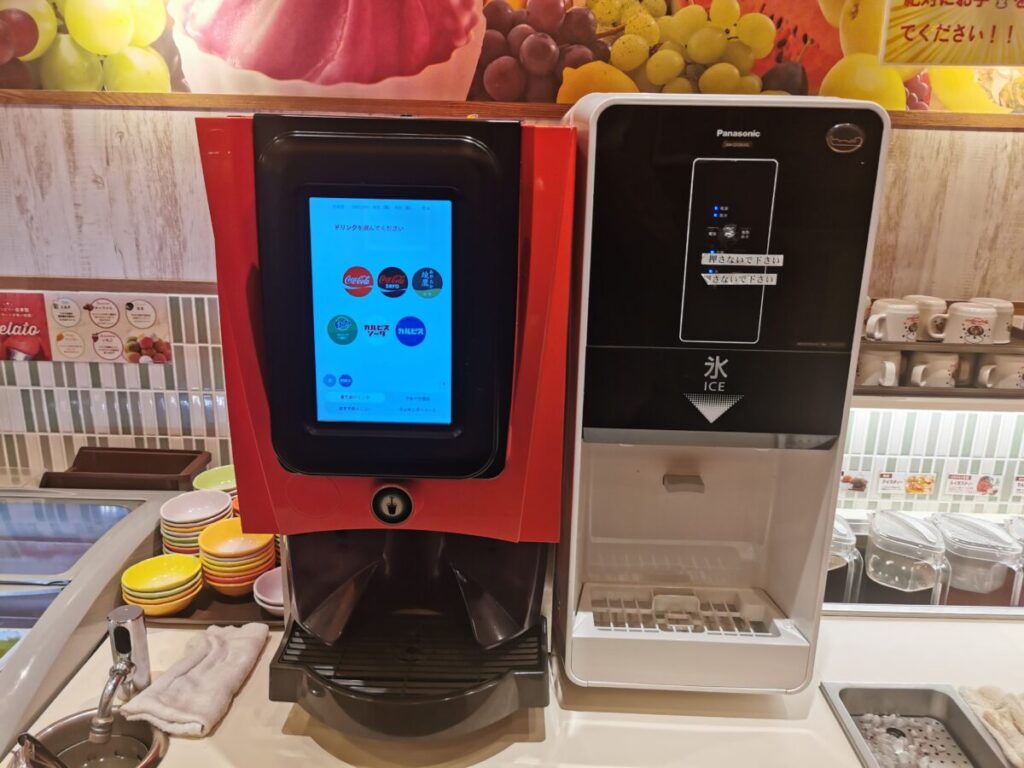 炭酸ディスペンサーではコーラ/ゼロ、メロン、カルピス系など定番が揃い、横に製氷機を完備。