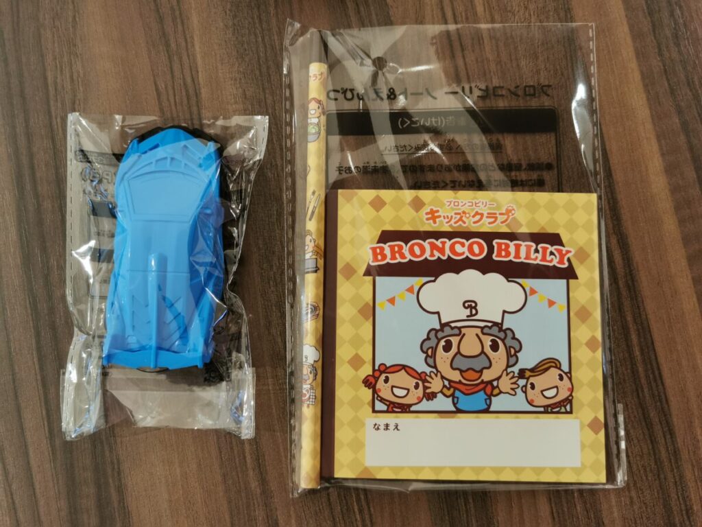 今回は車のおもちゃと、ブロンコビリーオリジナルの文具セットをゲット。
