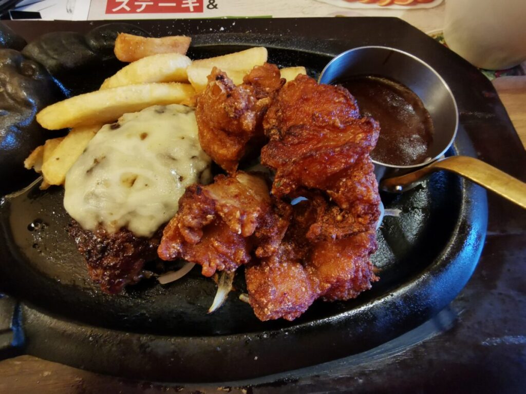 鉄板の上でジュージューと音を立てるのは、子どもに人気のチーズバーグとからあげの組み合わせ。
