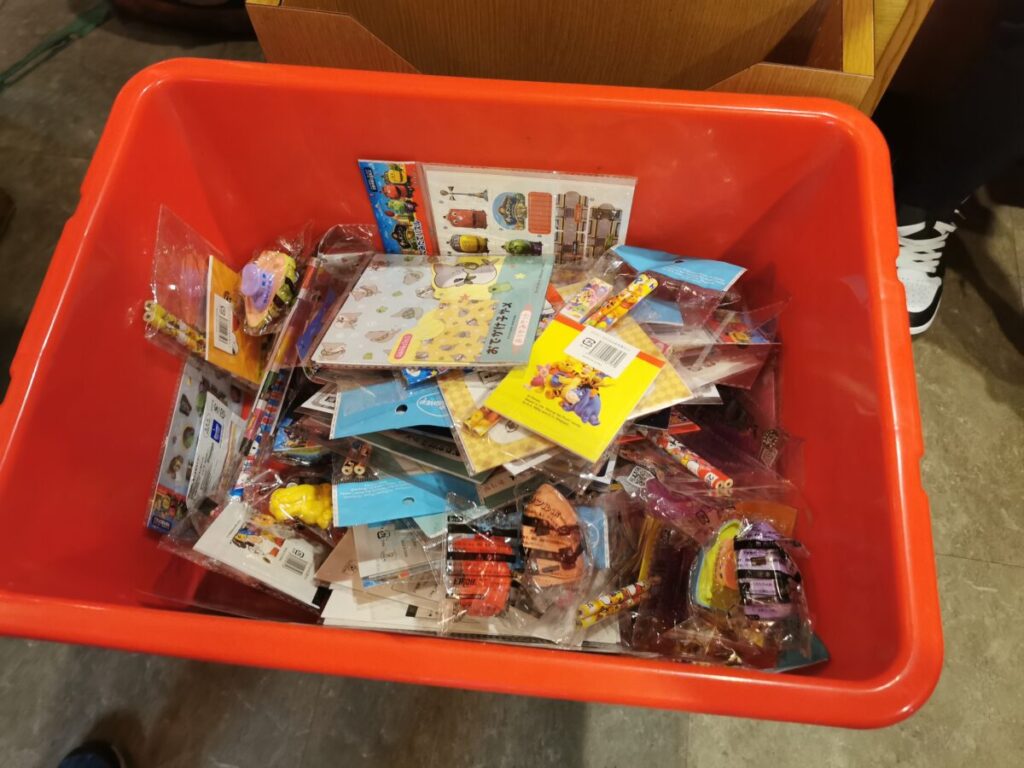 赤いボックスの中から自分で好きなものを選べるスタイルで、文房具から小さなフィギュア、シールまで種類が豊富。