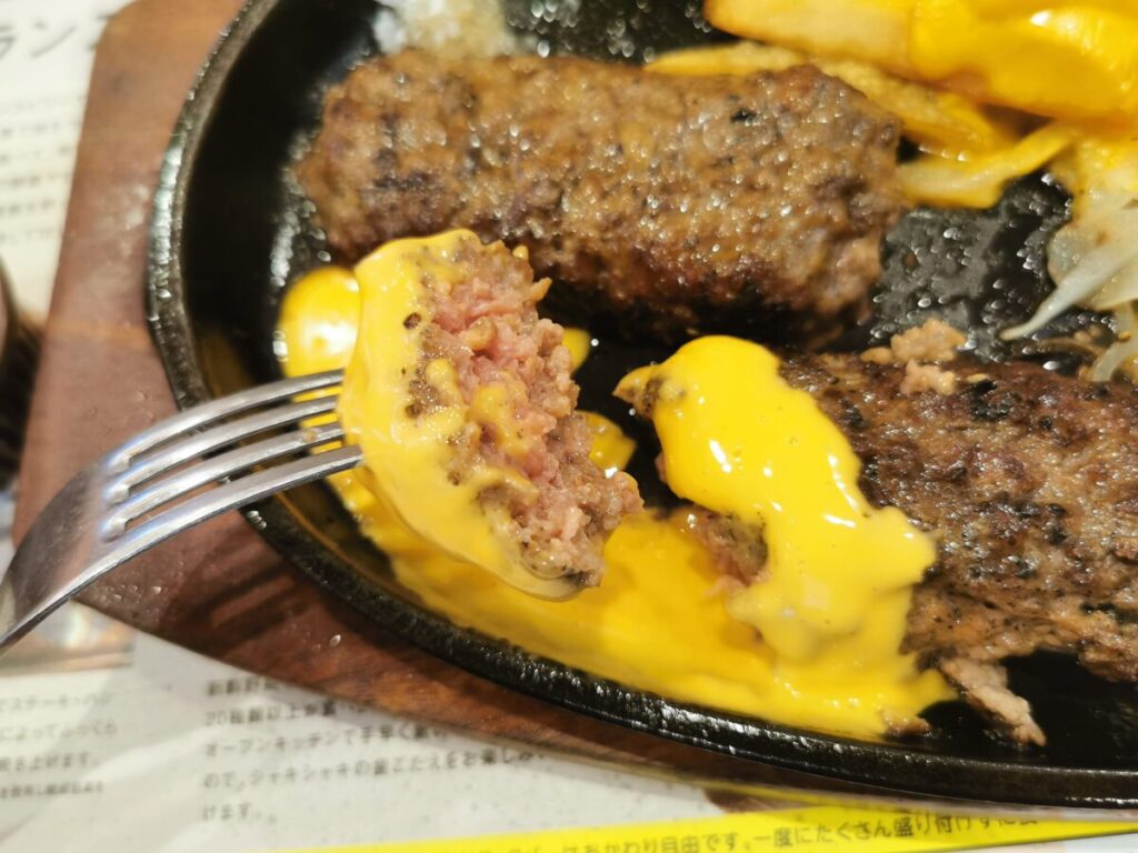 まず目を引くのは、こんがり焼かれたハンバーグの上にとろりと溶けたチーズ。