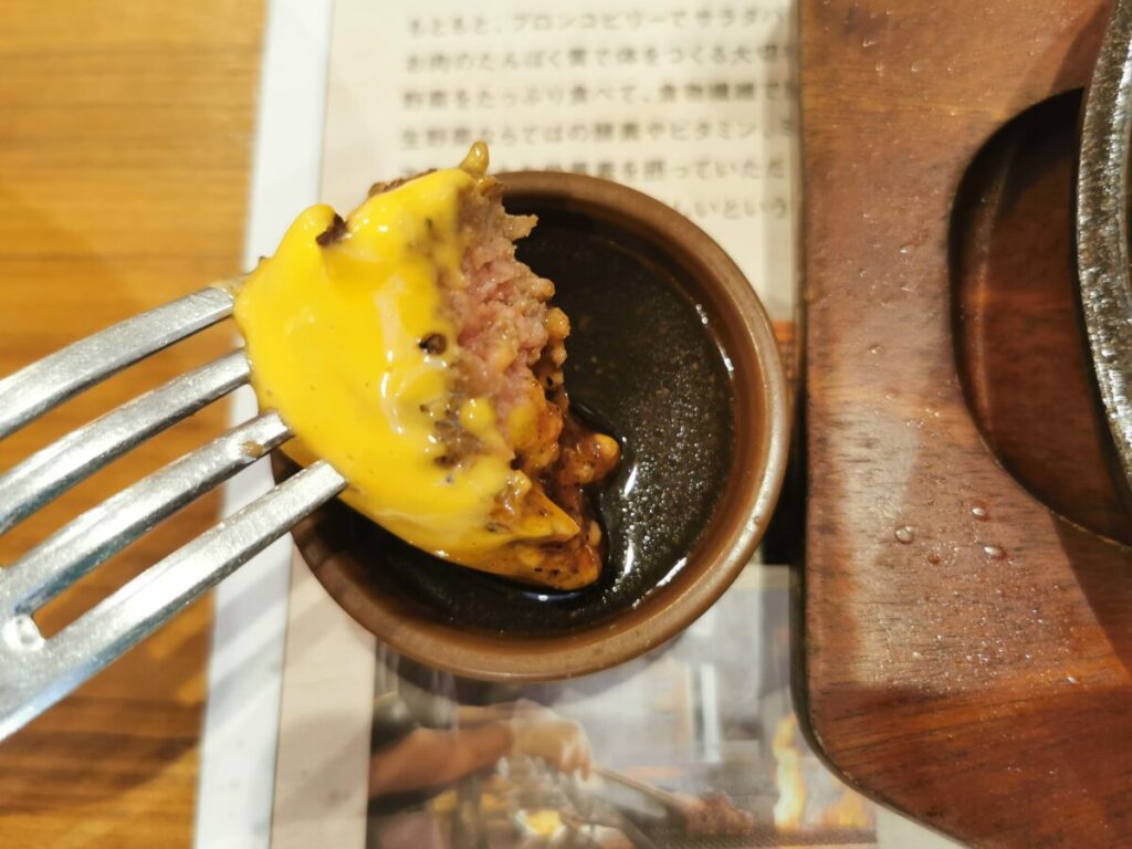 チェダーチーズをまとったハンバーグを軽くソースにくぐらせると、甘辛さと酸味がバランス良く絡み、濃厚ながらも後味はすっきり。