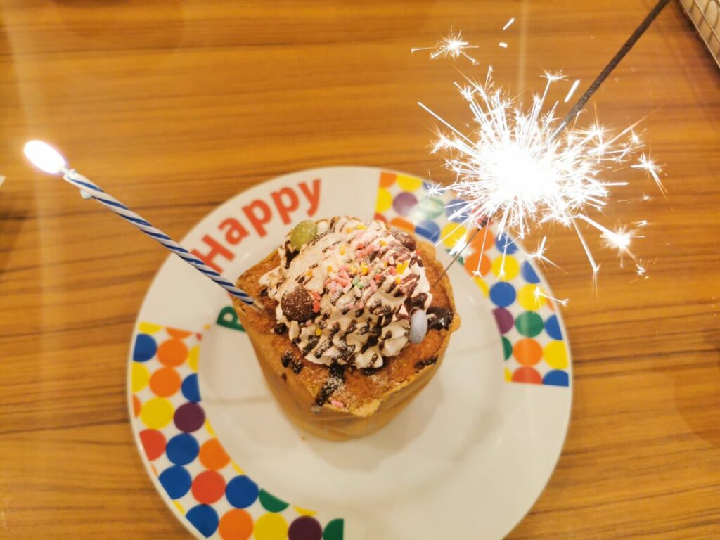 誕生日特典として、割引クーポンとともに、誕生日前後1か月の間に来店するとカップケーキ(シフォンケーキ)が貰えます。