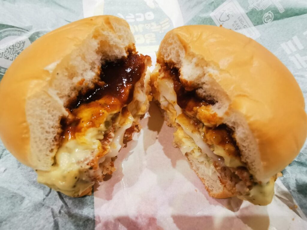 白・赤茶・白が重なった断面は、いかにも“期間限定バーガー”らしい情報量で、見ているだけでもちょっと楽しいです。
