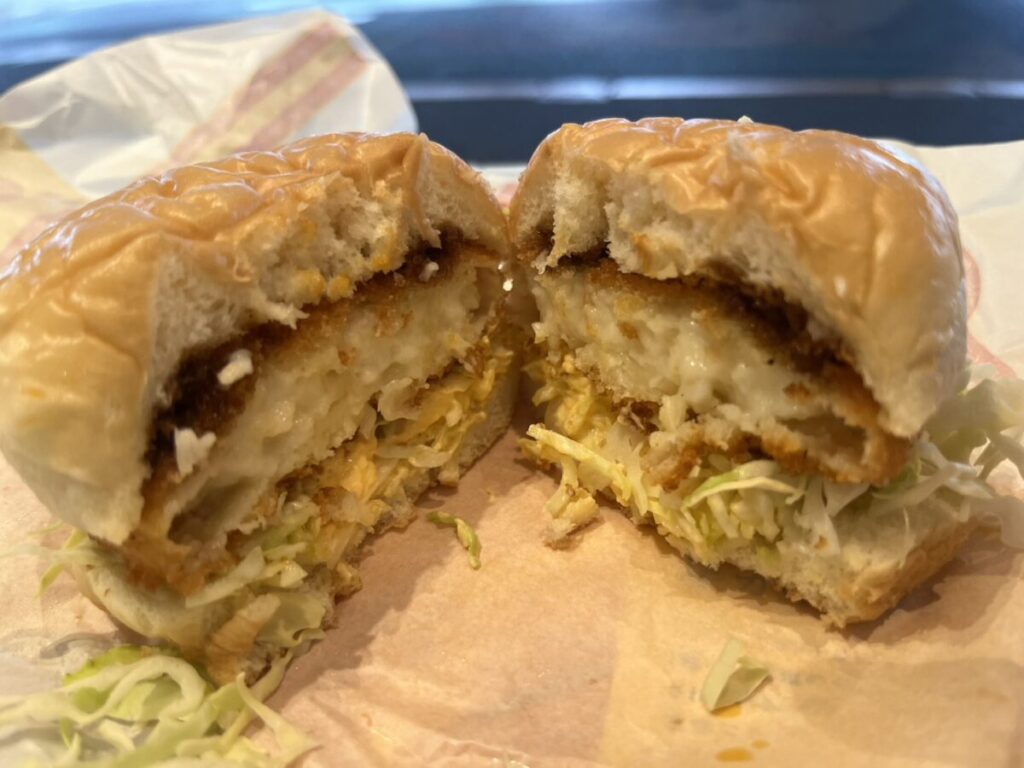 そのすぐあとに、熱々のクリームがとろっと広がり、バンズの甘みとタルタルの酸味がふわっと追いかけてきます。