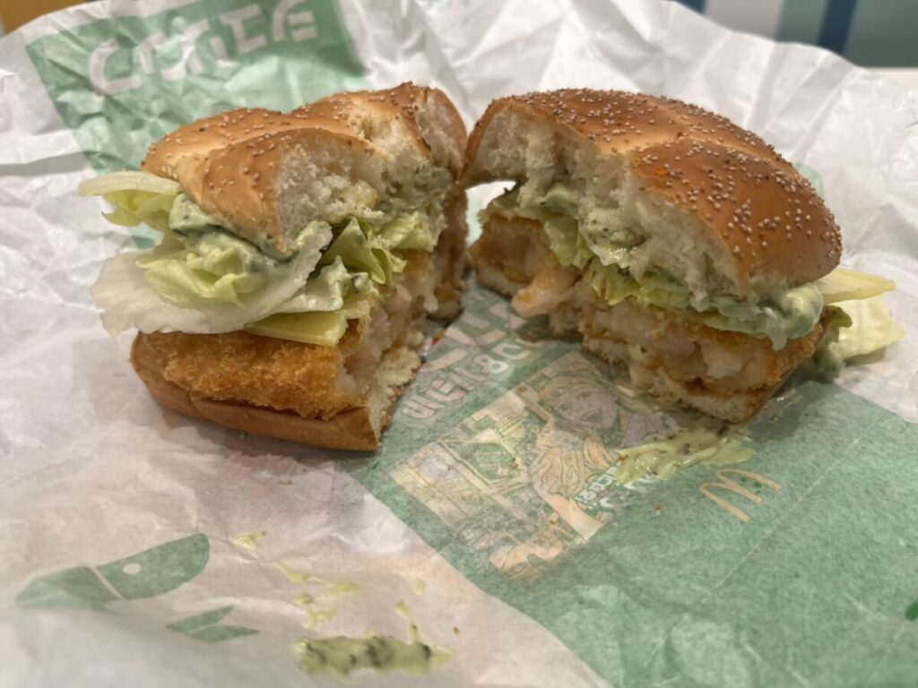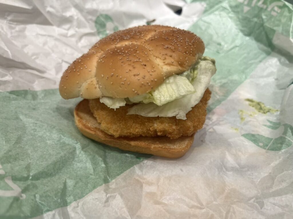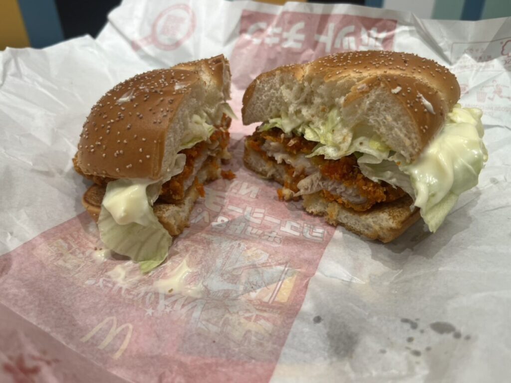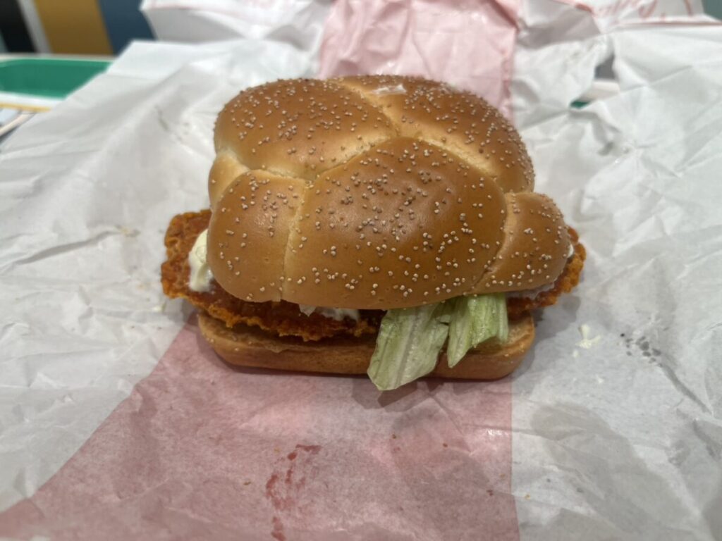 次はチキン。見た目でまず分かるのが、衣のザクザク感。四角バンズの限定感はそのままに、中身はシンプルに“チキンで勝負”という構成です。