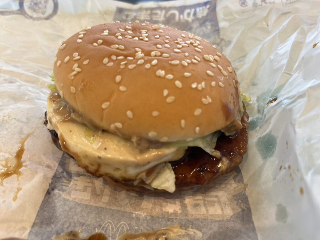 てりやきパティは厚みがそこまで極端ではないものの、ソースがしっかり絡んでいるので、切り口にも濃いめの茶色がにじんでいます。