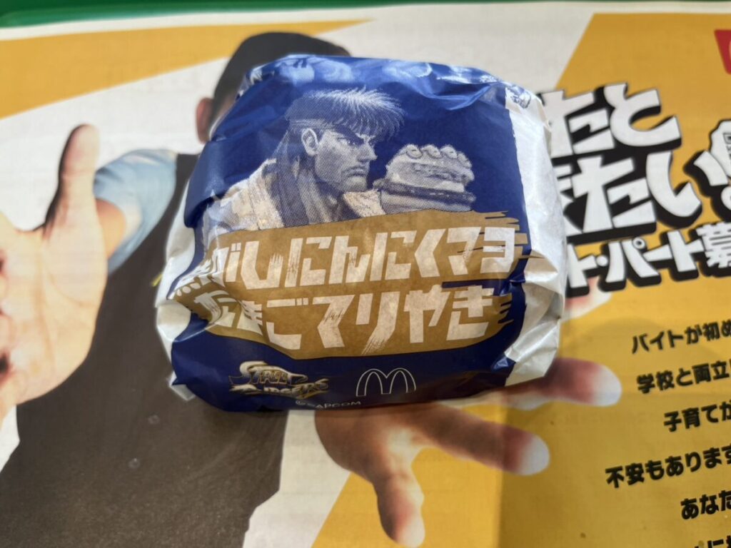 ふんわりバンズにてりやきパティ、たまご、そして焦がしにんにくマヨが重なっていて、構成は王道なのに香りが明らかに“格ゲーコラボの特別版”という感じです。