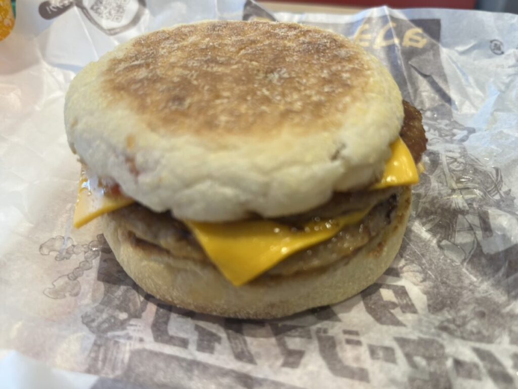 朝マック限定の「ダブチソーセージマフィン」は、ダブルチーズバーガーの味わいを“朝仕様”にリメイクしたような一品。