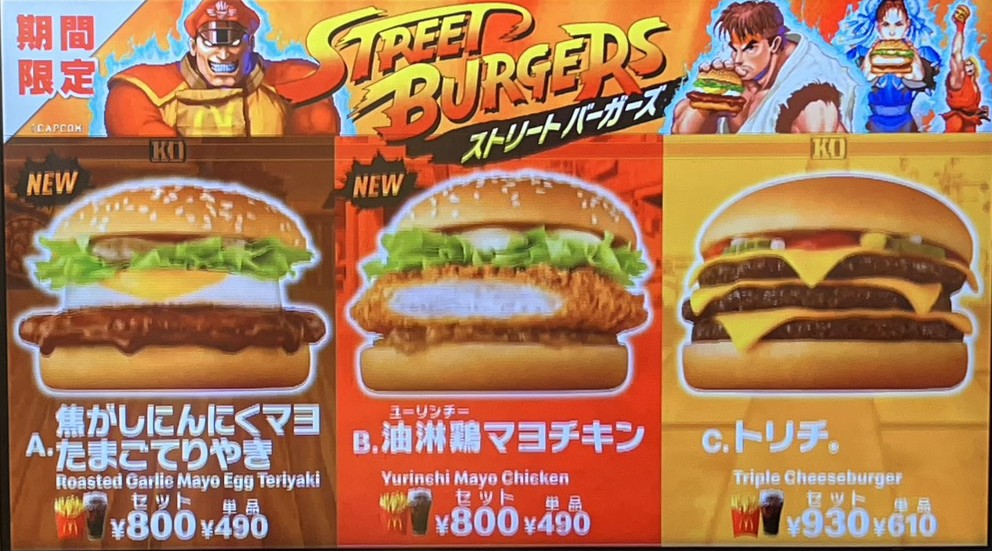 『ストリートファイター』シリーズと初コラボということで、リュウ・春麗・ケンをイメージした3種類のバーガー「焦がしにんにくマヨたまごてりやき」「油淋鶏マヨチキン」「トリチ」が一気に登場。さっそく株主優待券を使って実食してきました。