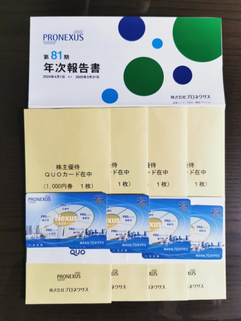 今回プロネクサス(7893)から届いたのは、合計4,000円分のQUOカードでした。